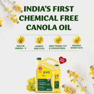 Jivo Cold Press Canola Oil is imported from the farms of Canada is extracted from the seed in the traditional way without using any chemicals refining process. This method preserves flavour and nutrients for the highest quality of the oil. Canola oil is low in saturated fat in comparison with other oils and rich in monounsaturated fatty acids. Canola oil may help in lowering bad cholesterol and may reduce the risk of heart disease. Ideal for all Indian & Western Cuisines, Cooking, Frying, Roasting, Grilling & for Baking. Canola oil is oil made from crushed canola seeds.